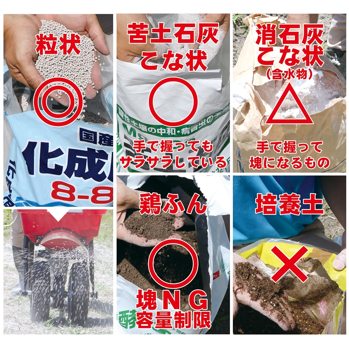 - 石灰、鶏糞等の土壌改良剤・肥料は比重が重いので、底面に固まり、排出(散布)されない場合があります