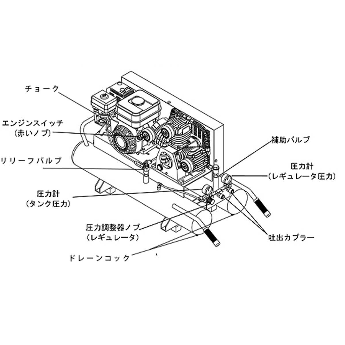 自動低速切り替え方式(エアー圧が0.98MPaに到達するとエンジン回転数が低速に切り替わり、0.7MPaに落ちると高速回転に切り替わります) - 目安エアー充填速度:0MPa〜0.98MPa充填速度約50秒