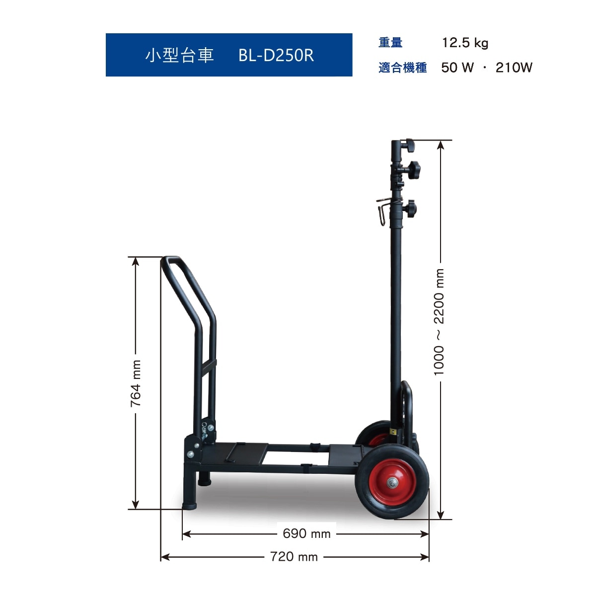 | 小型台車 | 型番:BL-D250R 寸法:高さ1000〜2200 幅470 奥行720mm 重量:12.5kg |