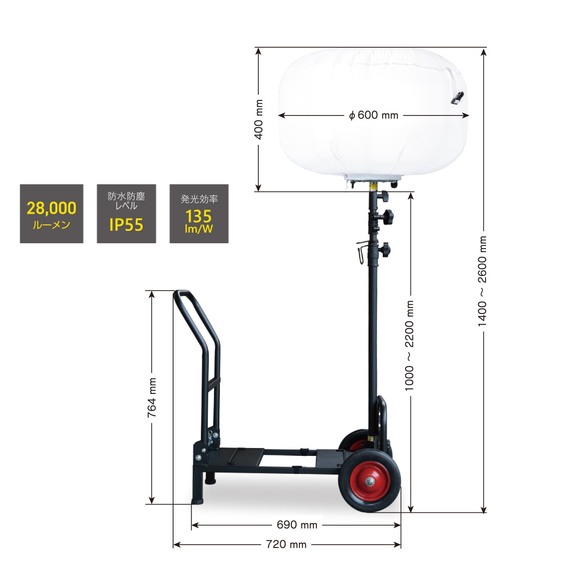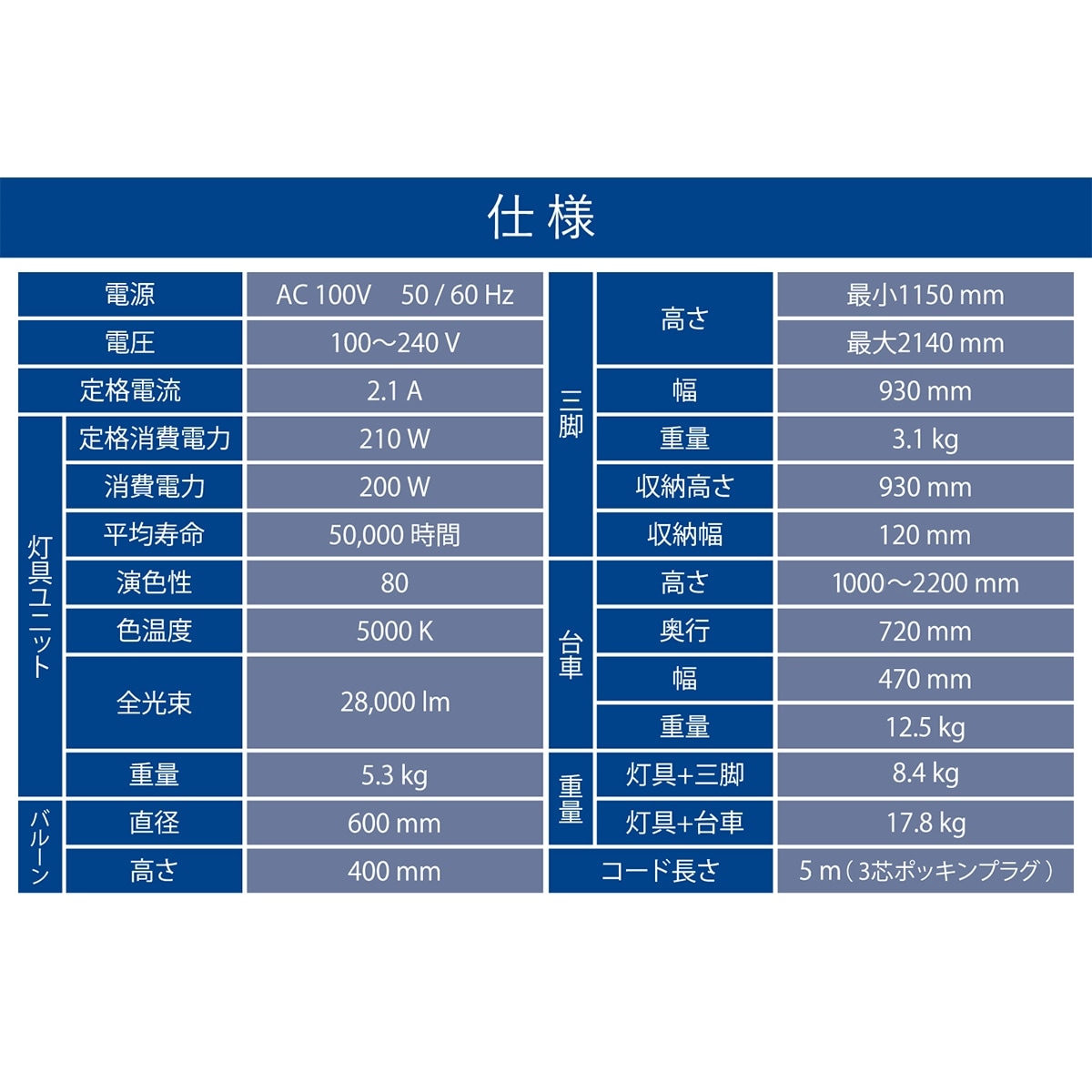 | 灯具ユニット | 【ランプ】 種 類 LED 消費電力:200W 全光束:28,000lm 【ファン】 定格電圧:DC24V 定格電流:0.52A 【外観】 全光・反射バルーン 直径:600mm 高さ:400mm 【コード長さ】 5m(3芯ポッキンプラグ) ※ 灯具収納用ケース付 |