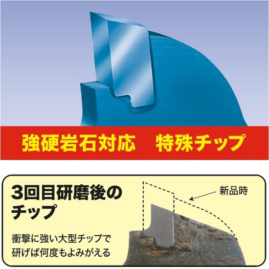 - 強硬岩石対応特殊チップ使用により、チップの欠けを極限に軽減し、驚異の耐衝撃性能を実現