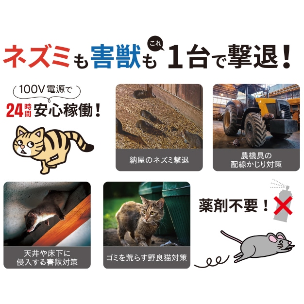 - 単相100N電源のため、電池切れの心配なく害獣対策ができます。