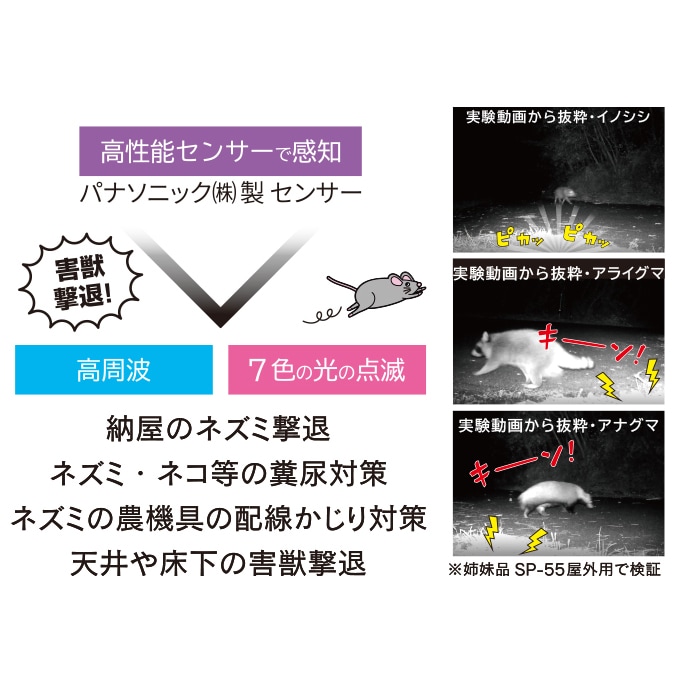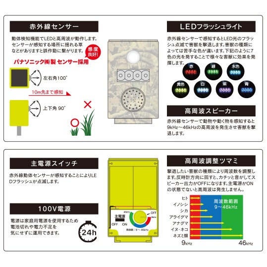 - 赤→緑→水色→黄色→青→紫→色の順に点滅し様々な害獣に効果を発揮します
