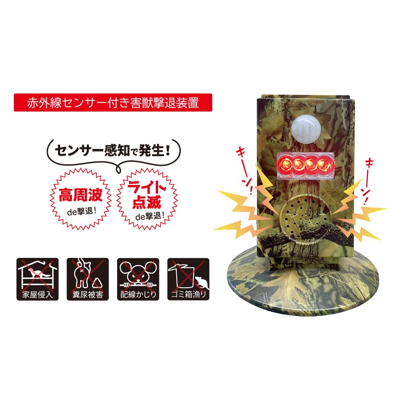 - 赤外線センサーで動物や動く物を感知すると高周波を発生させ害獣を撃退します